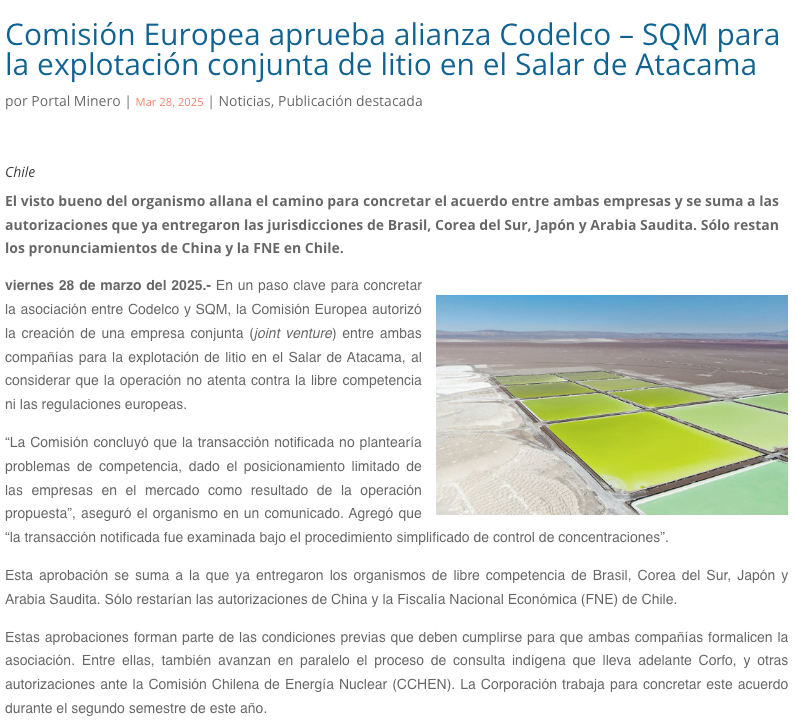 Codelco y SQM obtienen aprobación de la Comisión Europea para explotar litio en el Salar de Atacama - (mineriayfuturo.cl)
