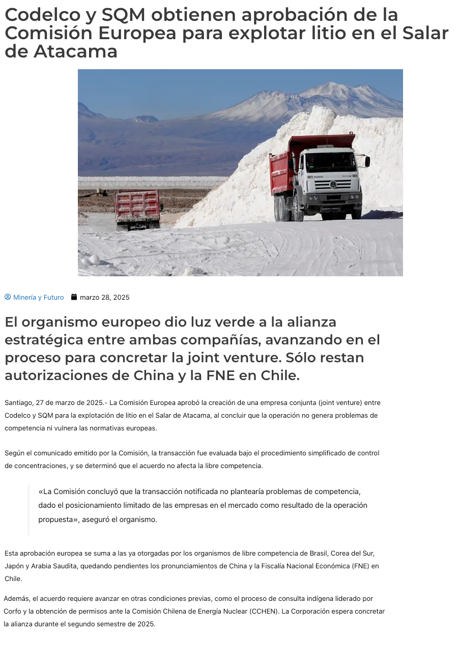 Comisión Europea aprueba alianza Codelco – SQM para la explotación conjunta de litio en el Salar de Atacama - (mvcomunicaciones.cl)