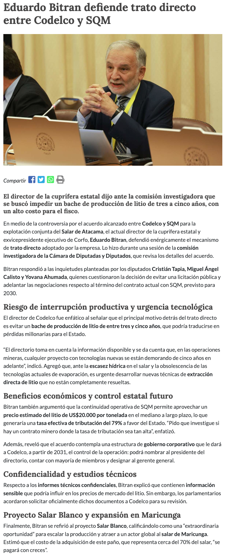 Eduardo Bitran defendió decisión de Codelco de realizar trato directo con SQM - (electromineria.cl)