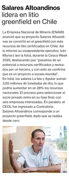 Enami afirma que recursos de litio del proyecto Salares Altoandinos superan a Maricunga - (Pulso)