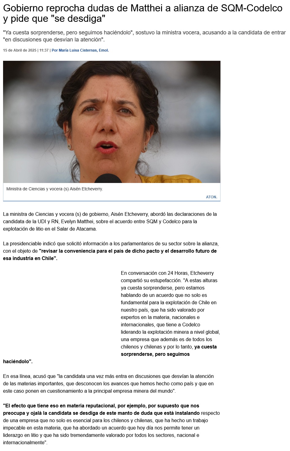 La respuesta del Gobierno, Tohá y Codelco contra Matthei tras solicitar la revisión del acuerdo de explotación de litio con SQM - (The Clinic online)