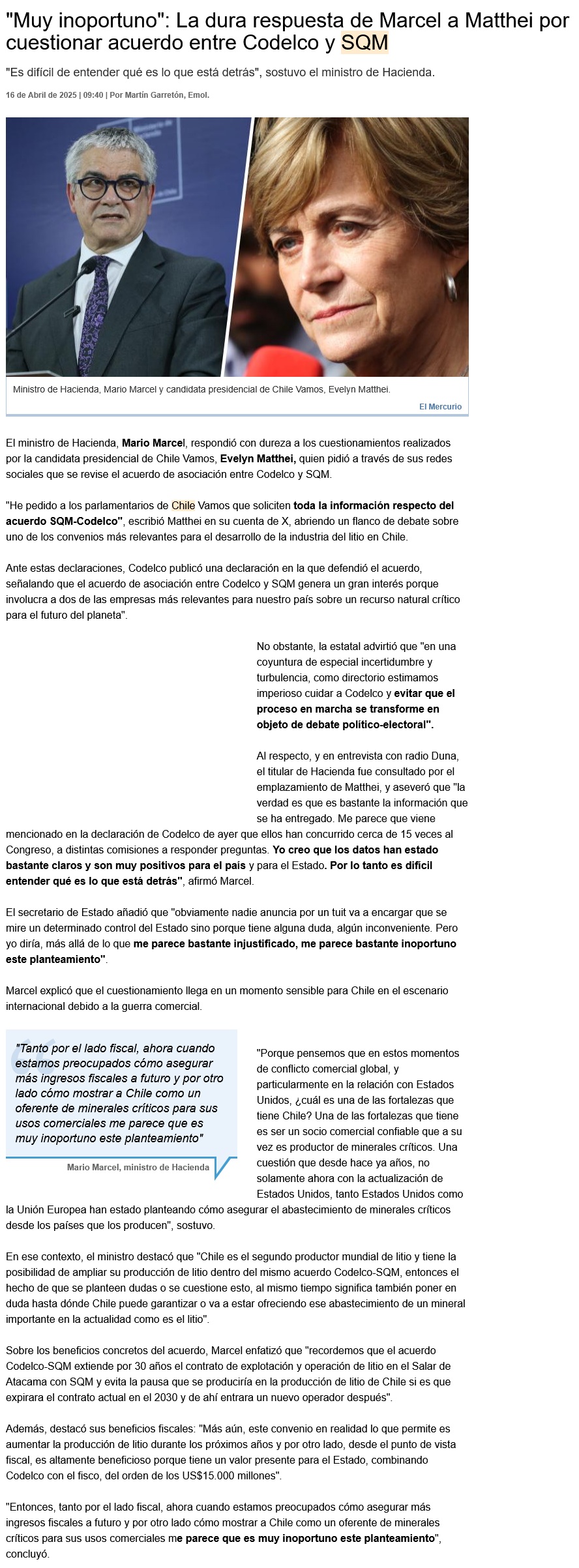 Marcel apunta contra Matthei tras reparos a acuerdo Codelco – SQM en medio de guerra comercial: “Es bastante inoportuno” - (cnnchile.com)