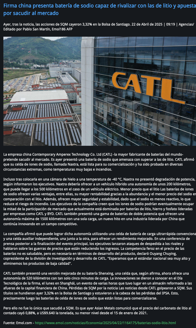 Firma china presenta batería de sodio capaz de rivalizar con las de litio y apuesta por sacudir al mercado - (emol)