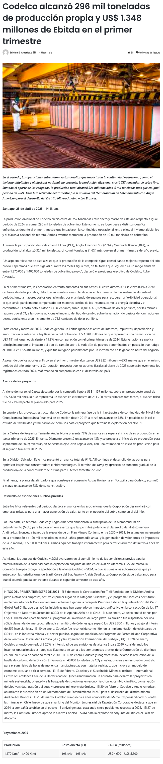 Codelco Enfrenta Desafíos en 1T 2025: Producción Estable, Pero Caída en Aportes Fiscales - (reportediario.cl)