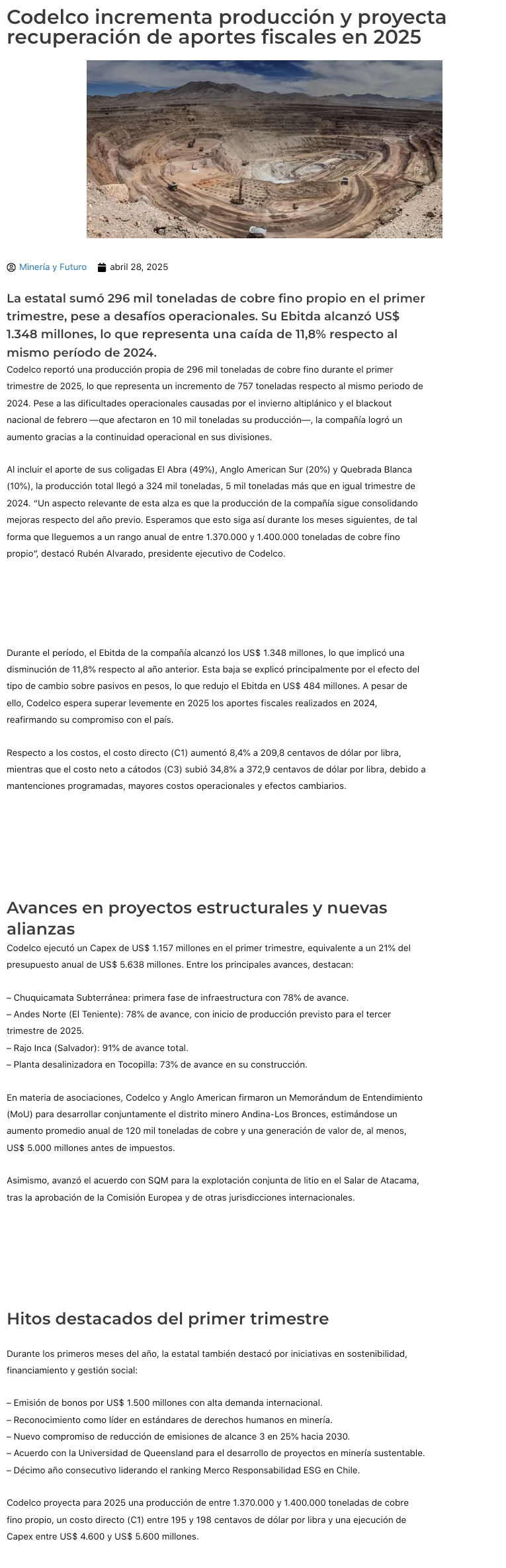 Codelco alcanzó 296 mil toneladas de producción propia y US$ 1.348 millones de Ebitda en el primer trimestre - (poderyliderazgo)