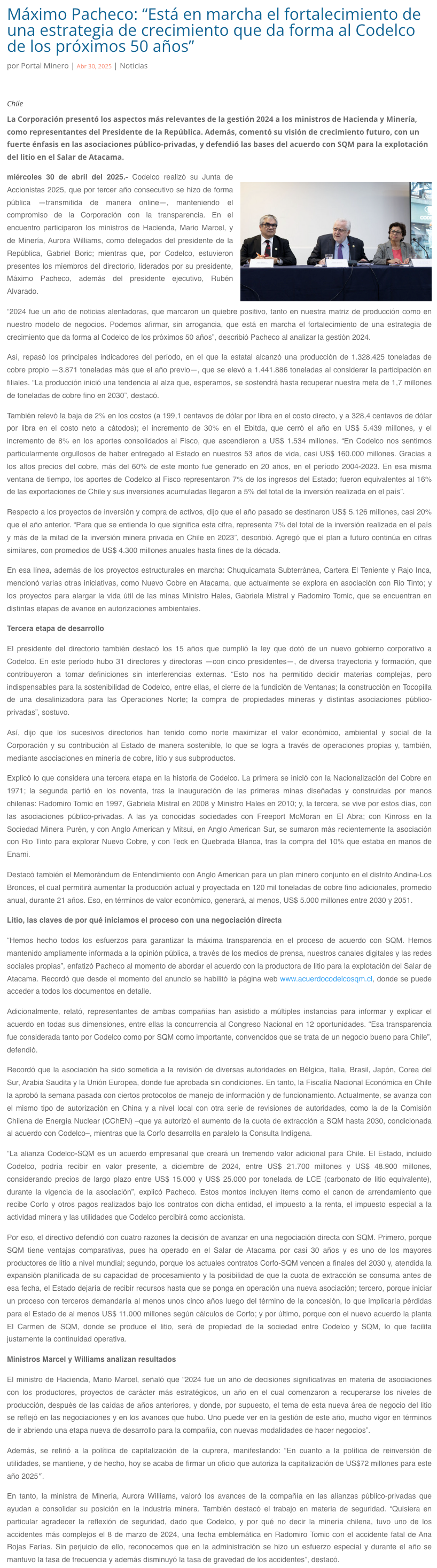 Máximo Pacheco, presidente del directorio de Codelco, en Junta de Accionistas 2025: “Está en marcha el fortalecimiento de una estrategia de crecimiento que da forma al Codelco de los próximos 50 años” - (mvcomunicaciones.cl)
