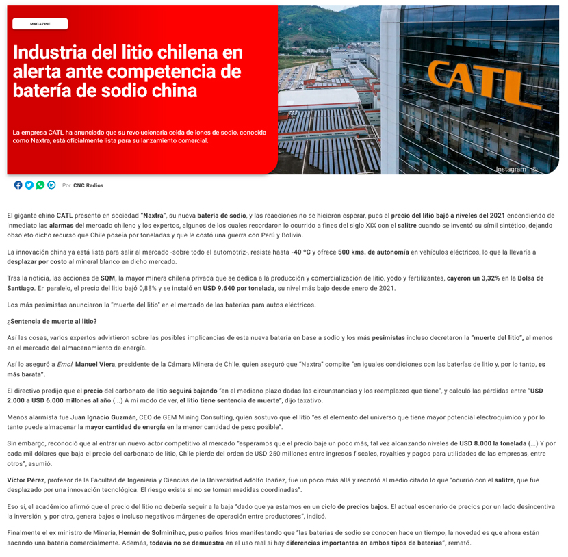 Industria del litio chilena en alerta ante competencia de batería de sodio china - (fmquiero.cl)