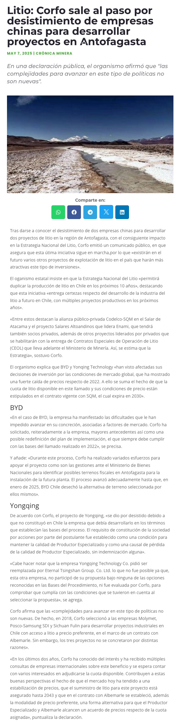 “Se espera contar con varios interesados”: La explicación de CORFO tras desistimiento de BYD y Tsingshan de proyectos de litio en Chile - (adnradio.cl)