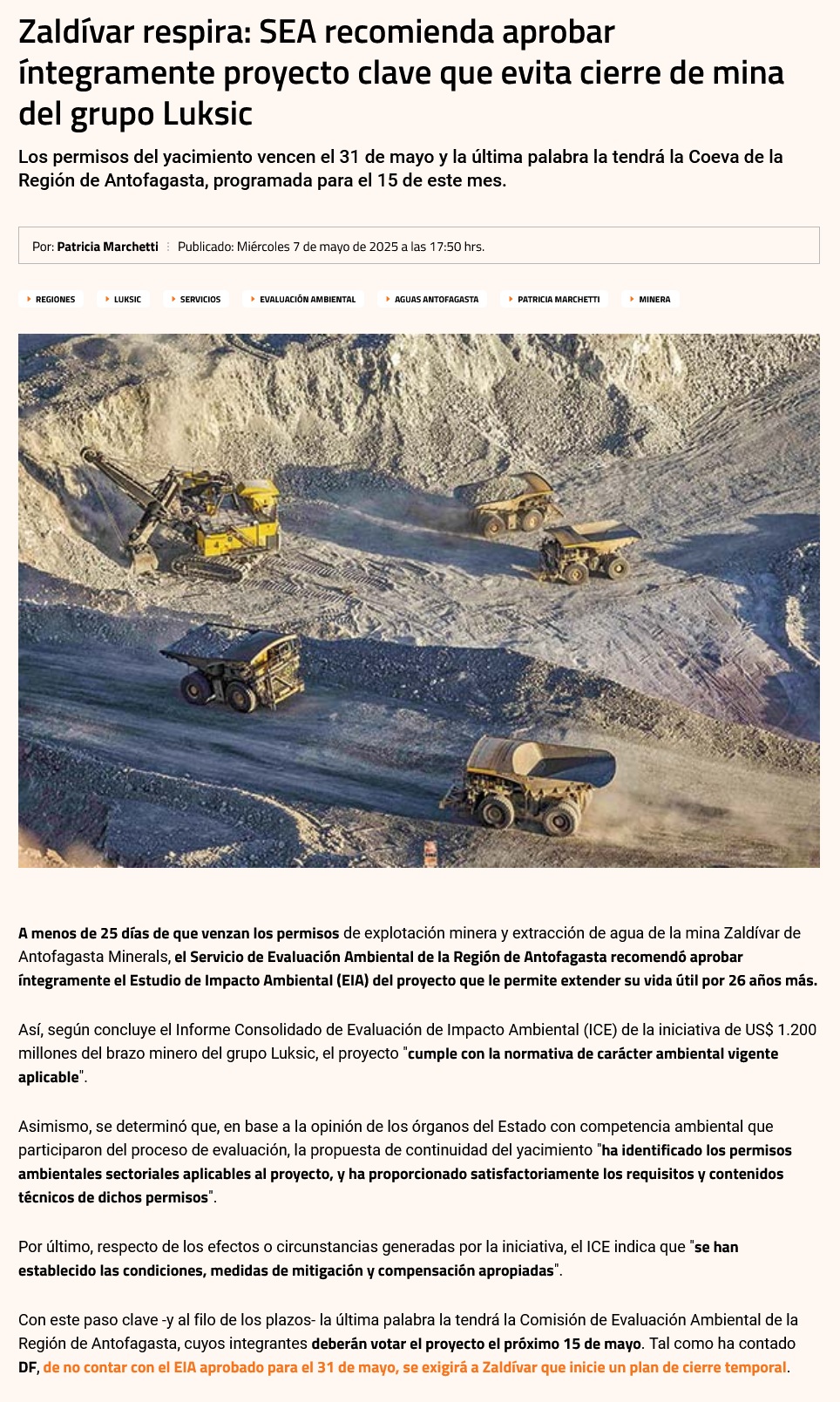 Zaldívar respira: SEA recomienda aprobar proyecto que evita cierre de mina del grupo Luksic - (Diario Financiero)