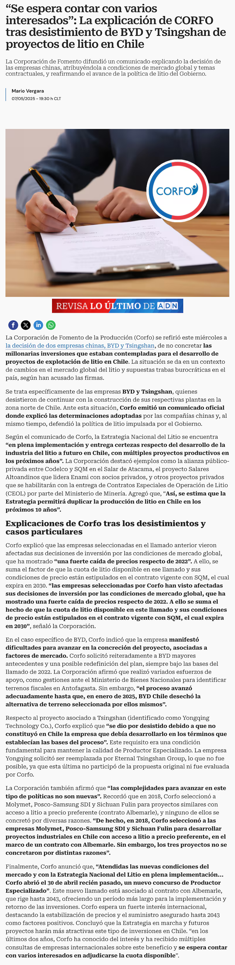 Corfo defendió Estrategia Nacional del Litio tras cancelación de proyectos de BYD y Tsingshan - (cooperativa online)