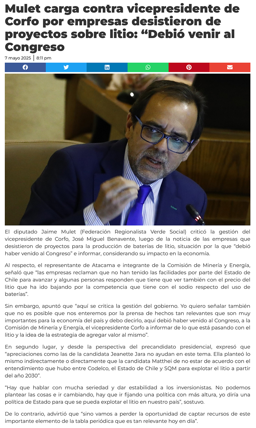 Diputados citarán "de urgencia" a ministros Grau, Williams y Corfo por "fracaso" de proyectos industriales de litio - (DF Online)