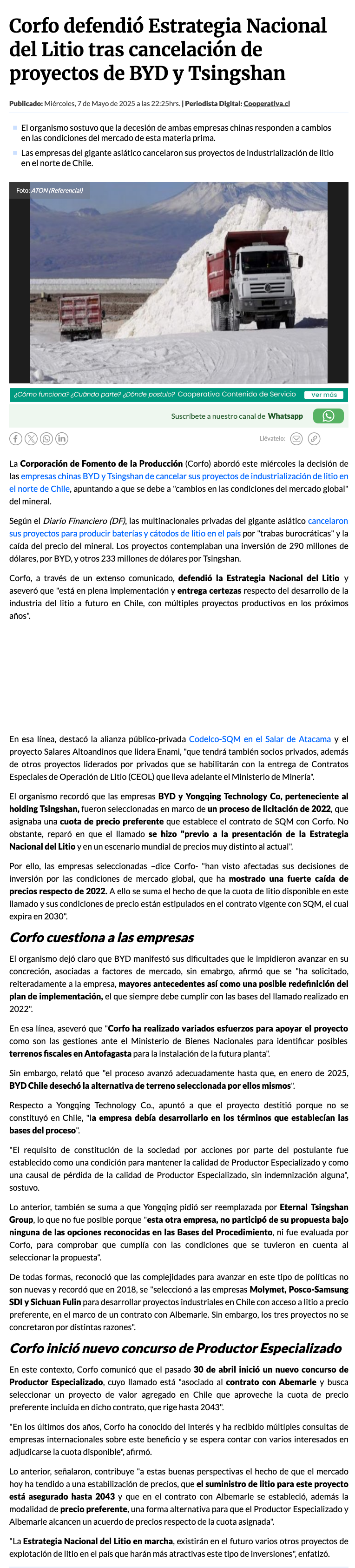 “Se espera contar con varios interesados”: La explicación de CORFO tras desistimiento de BYD y Tsingshan de proyectos de litio en Chile - (adnradio.cl)