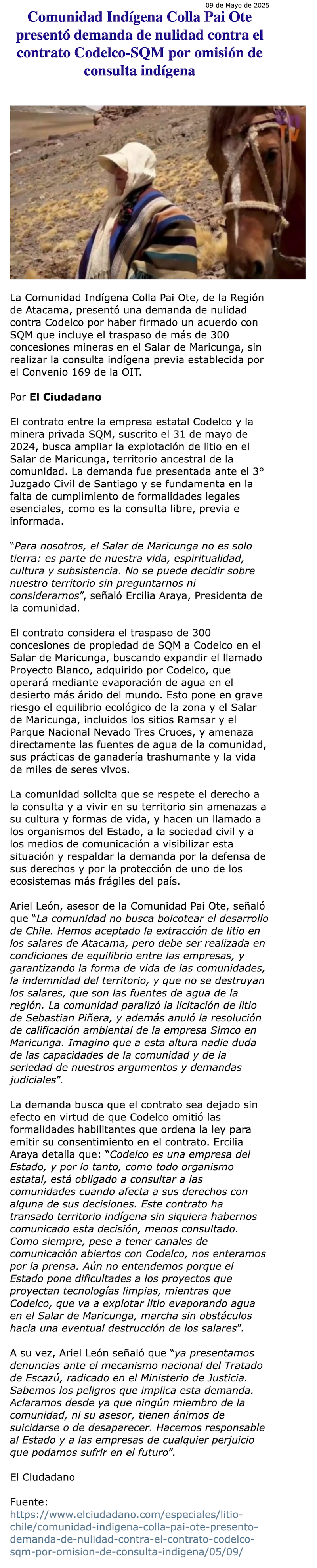 Comunidad Indígena Colla Pai Ote presentó demanda de nulidad contra el contrato Codelco-SQM por omisión de consulta indígena - (elamerica)