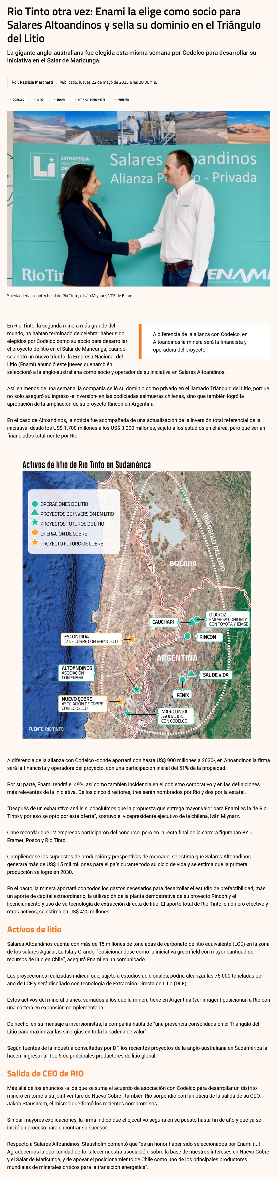 Rio Tinto otra vez: Enami la elige como socio para Salares Altoandinos y sella su dominio en el Triángulo del Litio - (Diario Financiero)