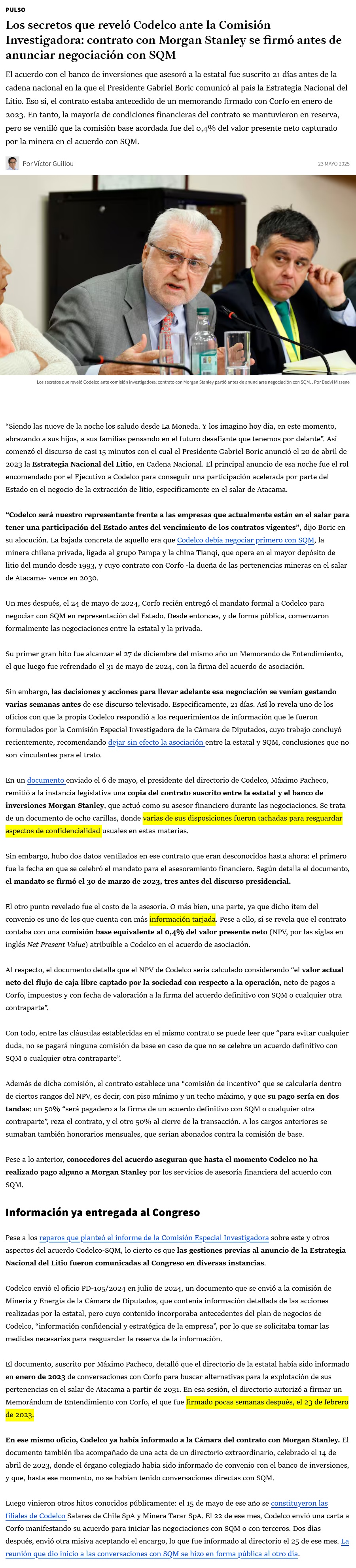 Los secretos que reveló Codelco ante la Comisión Investigadora: contrato con Morgan Stanley se firmó antes de anunciar negociación con SQM - (Pulso)