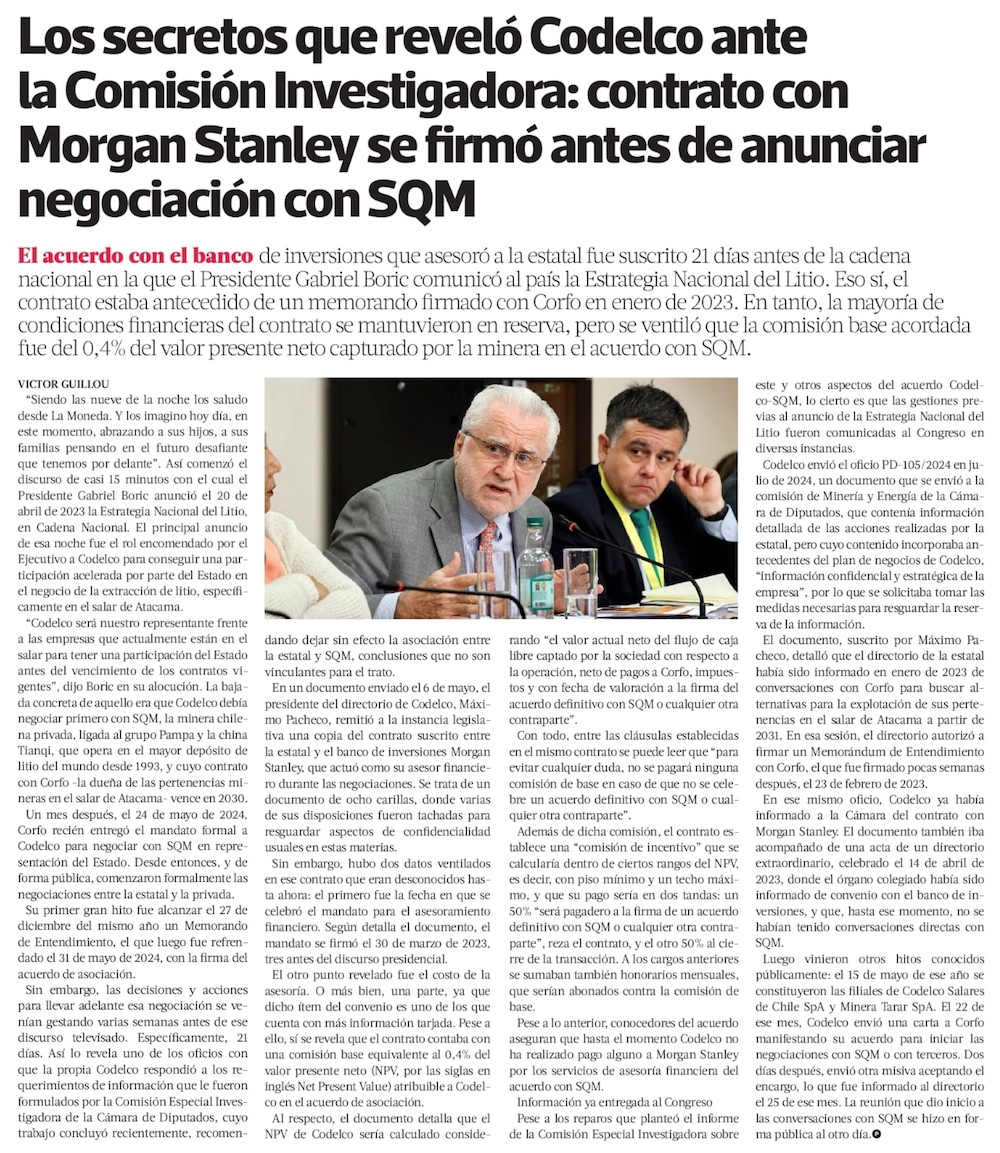 Los secretos que reveló Codelco ante la Comisión Investigadora: contrato con Morgan Stanley se firmó antes de anunciar negociación con SQM - (La Tercera Online)