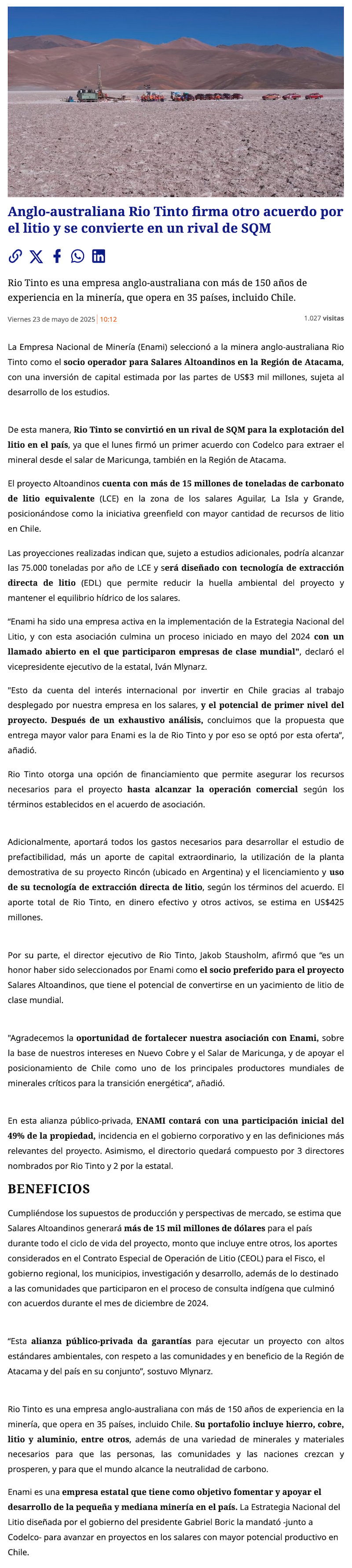 Río Tinto ya suma tres acuerdos para la explotación de litio en Chile - (Radio Biobío)