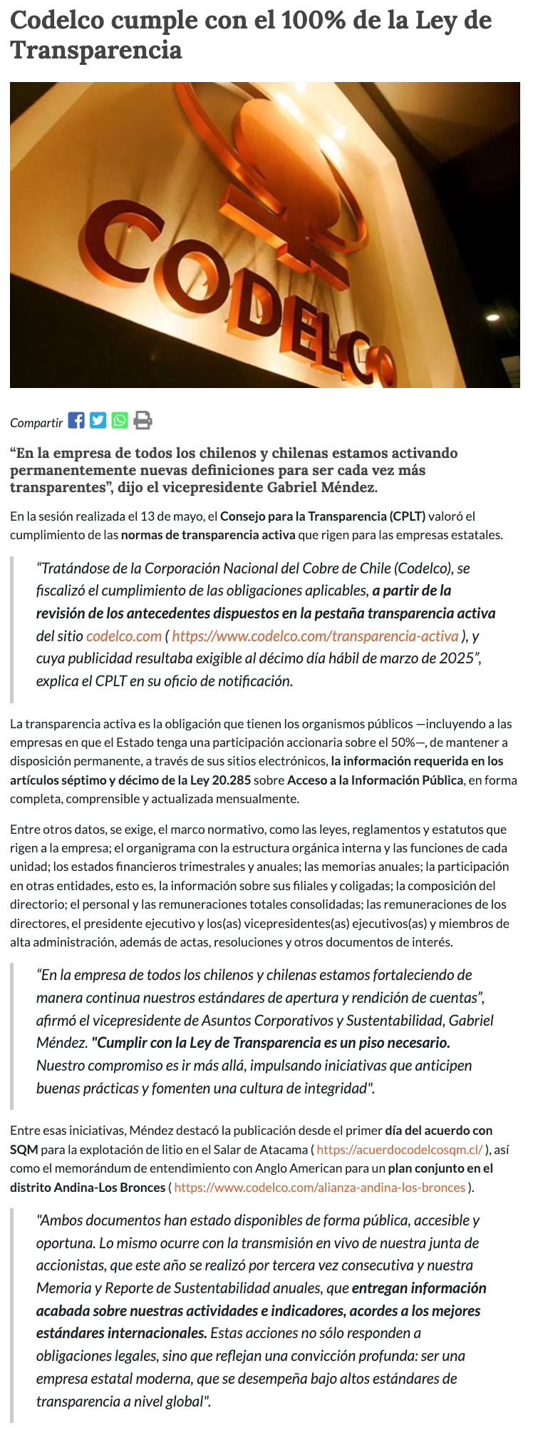 Codelco logra cumplimiento total de la Ley de Transparencia: Publicación de acuerdos clave y transmisión en vivo de juntas refuerzan transparencia activa - (electromineria.cl)