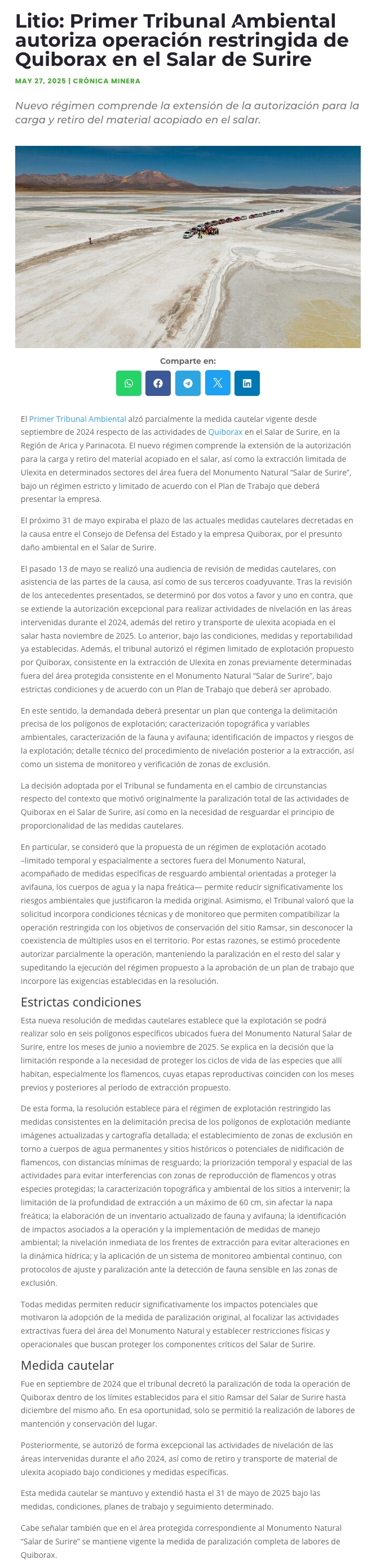 Extienden autorización excepcional de Quiborax para operar en Surire - (El Mercurio de Antofagasta)