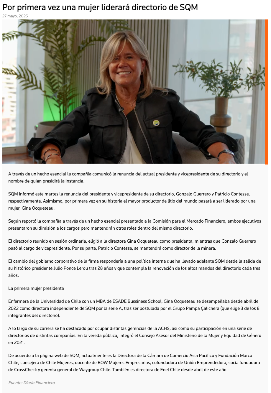 SQM renueva su mesa y nombra a Gina Ocqueteau como presidenta del directorio - (El Mercurio de Santiago)