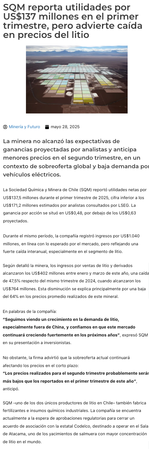 SQM logra utilidades en el primer trimestre y los ingresos por litio bajan pese a volúmenes récord - (DF Online)