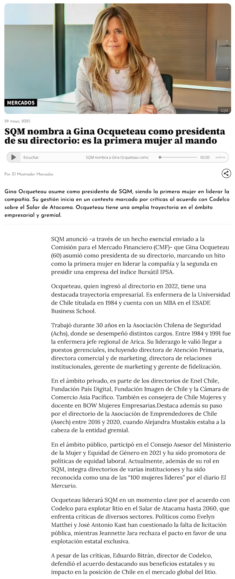 Gina Ocqueteau asume como la primera mujer presidenta del directorio de SQM - (calamaenlinea.cl)