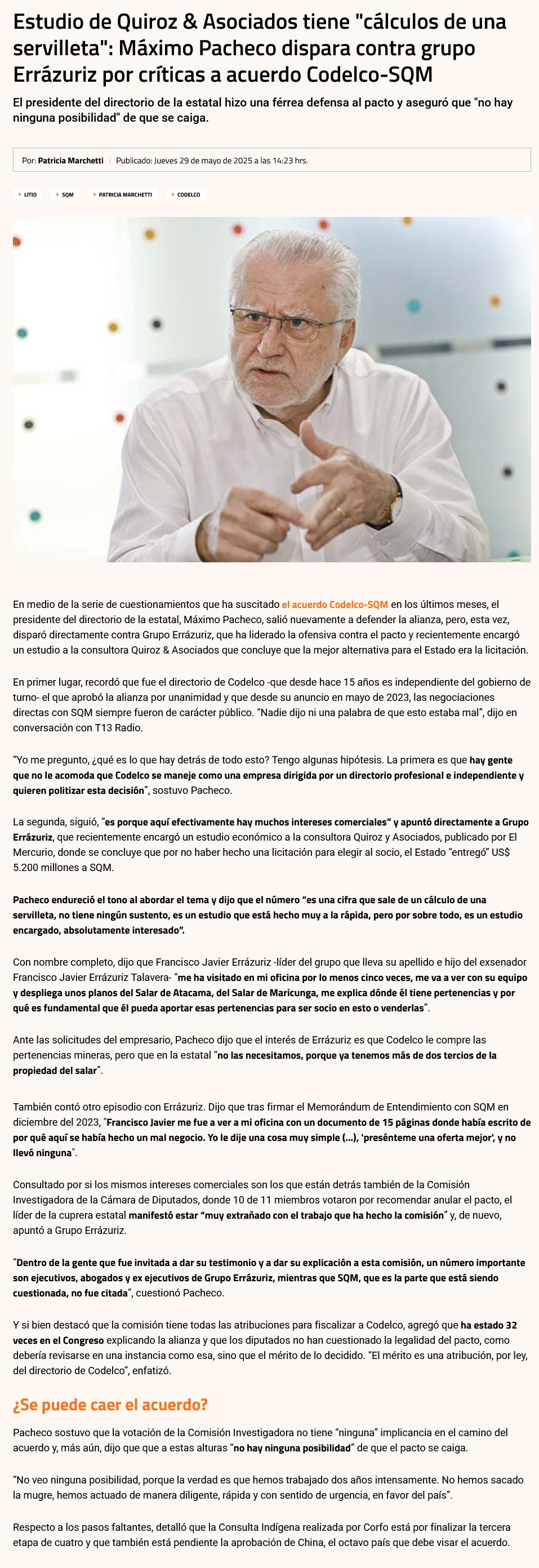 “Cálculo de una servilleta”: Máximo Pacheco critica informe de Quiroz & Asociados y apunta al grupo Errázuriz por críticas a Codelco-SQM - (La Tercera Online)