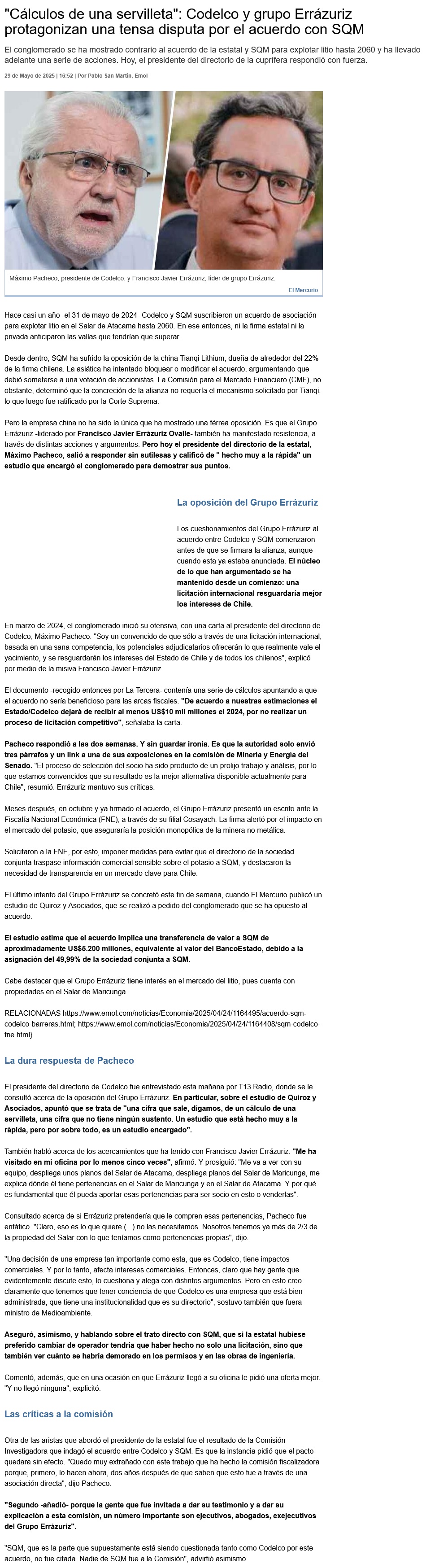 “Cálculo de una servilleta”: Máximo Pacheco critica informe de Quiroz & Asociados y apunta al grupo Errázuriz por críticas a Codelco-SQM - (La Tercera Online)