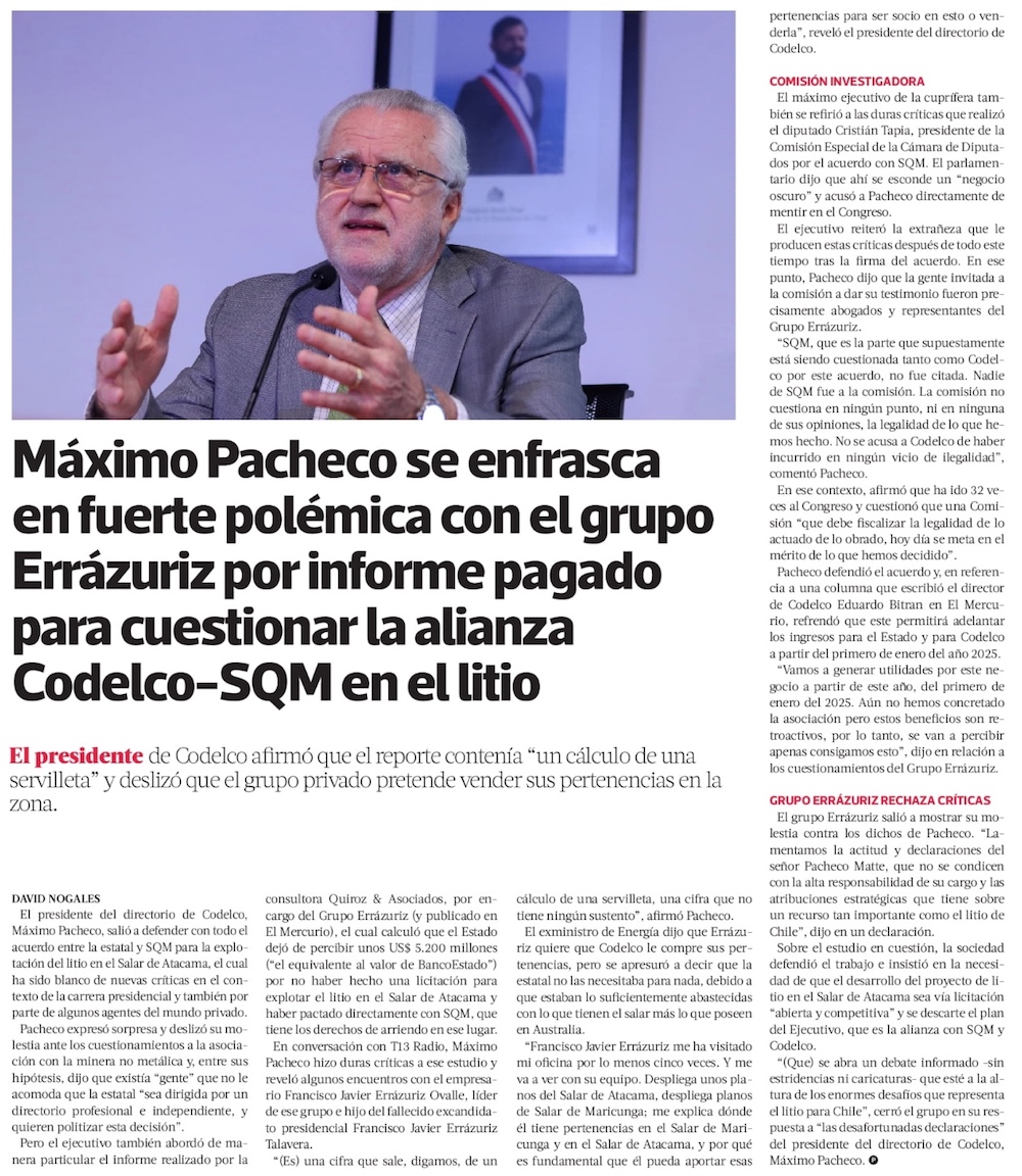 “Cálculo de una servilleta”: Máximo Pacheco critica informe de Quiroz & Asociados y apunta al grupo Errázuriz por críticas a Codelco-SQM - (La Tercera Online)
