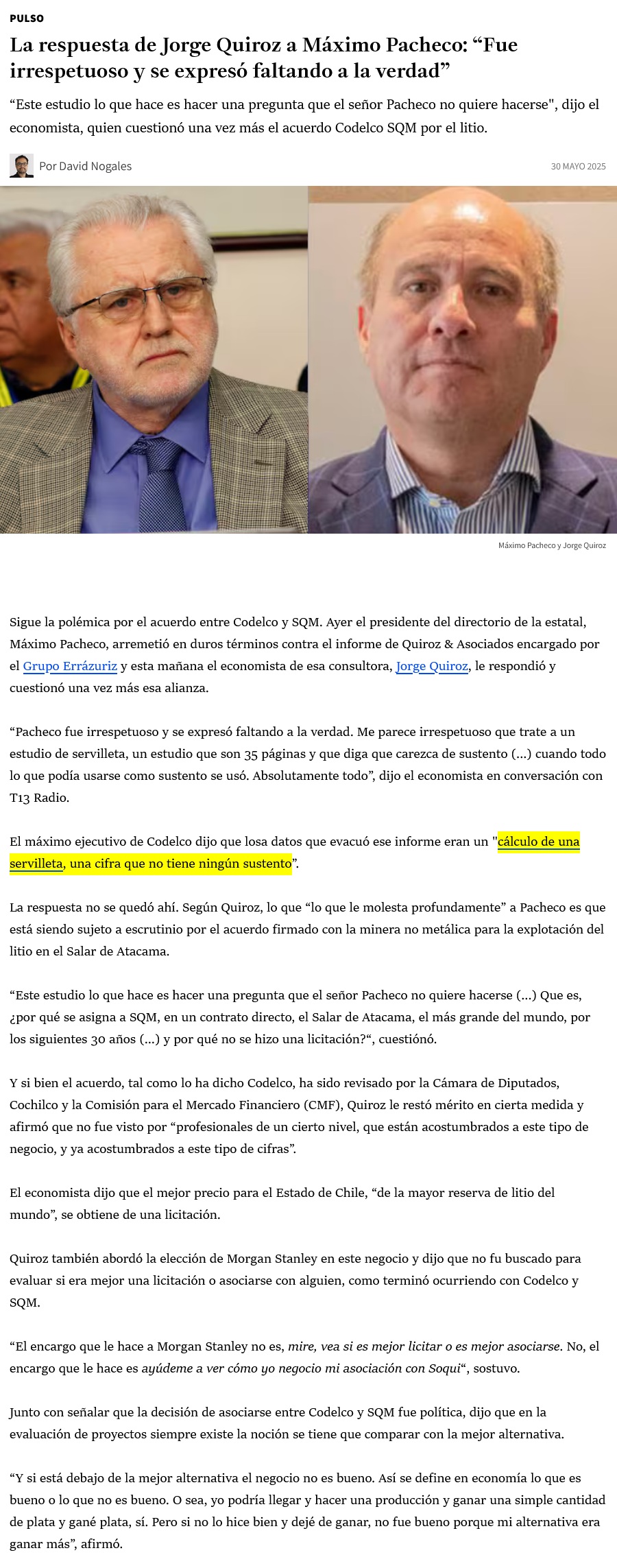 "Irrespetuoso": Quiroz responde a Pacheco tras críticas a estudio que cuestiona acuerdo Codelco-SQM - (emol)