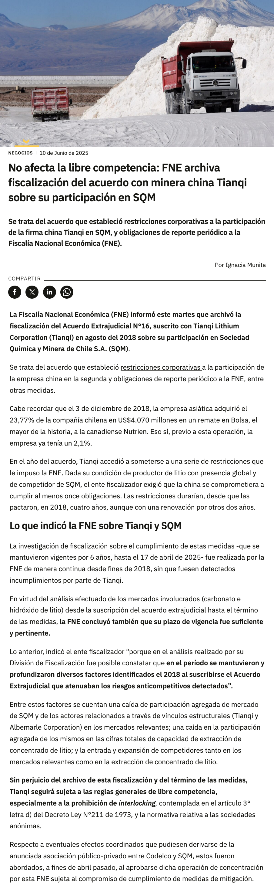 Sin riesgos anticompetitivos: FNE archiva fiscalización sobre participación de Tianqi en SQM - (Diario Financiero)