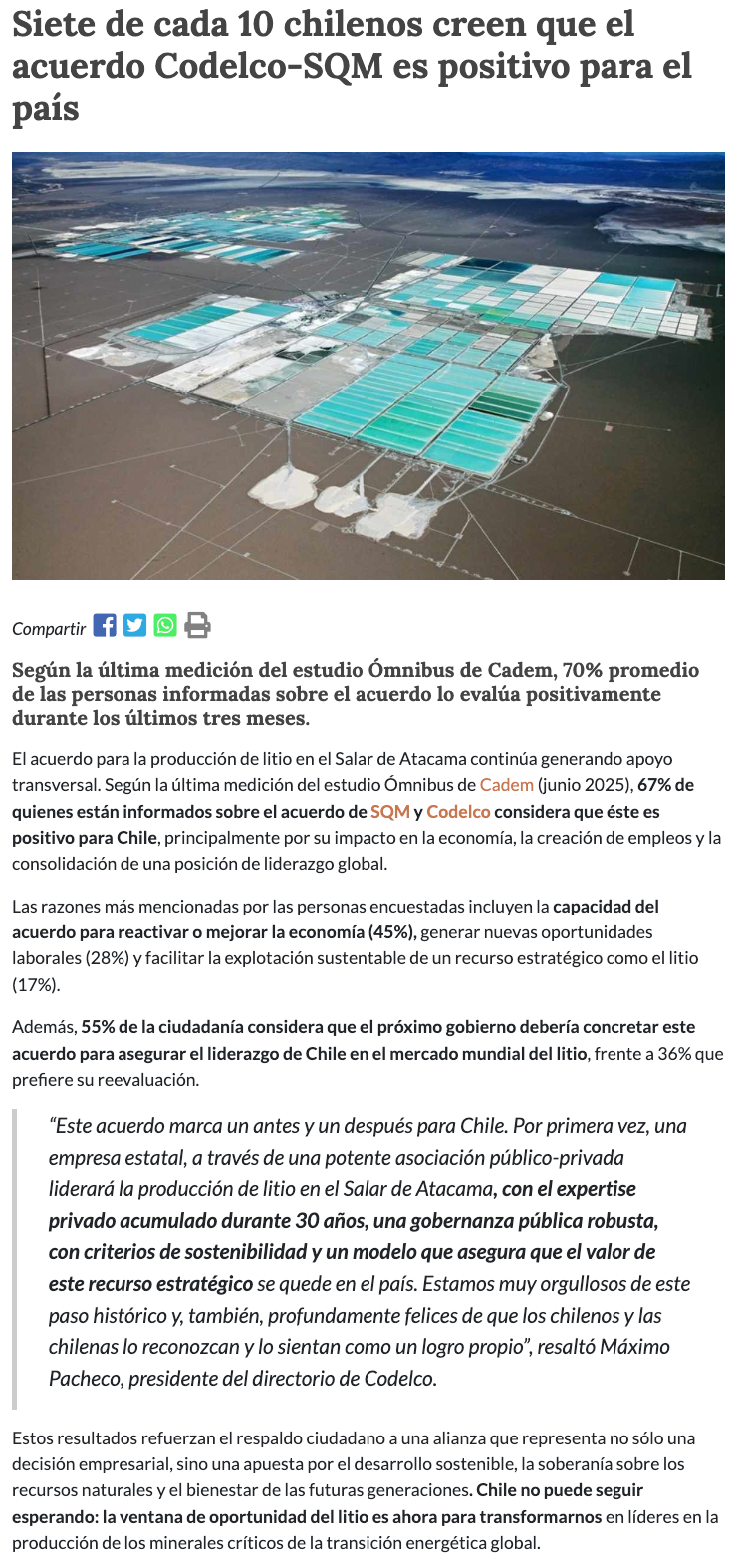 Siete de cada 10 chilenos creen que el acuerdo Codelco-SQM es positivo para el país - (mvcomunicaciones.cl)