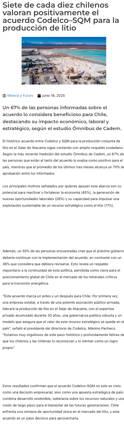 Siete de cada 10 chilenos creen que el acuerdo Codelco-SQM es positivo para el país - (mvcomunicaciones.cl)