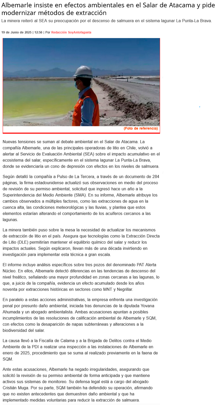 Albemarle pide la urgente revisión ambiental en el Salar de Atacama por impactos acumulativos - (El Mercurio de Antofagasta)