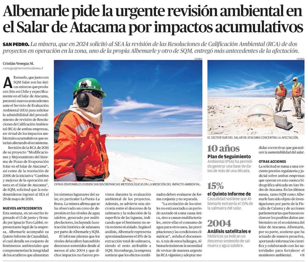 Albemarle pide la urgente revisión ambiental en el Salar de Atacama por impactos acumulativos - (El Mercurio de Antofagasta)