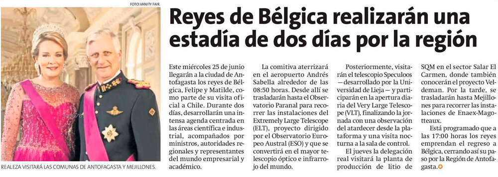 Reyes de Bélgica visitan observatorios y plantas industriales en Antofagasta - (El Mercurio de Antofagasta)