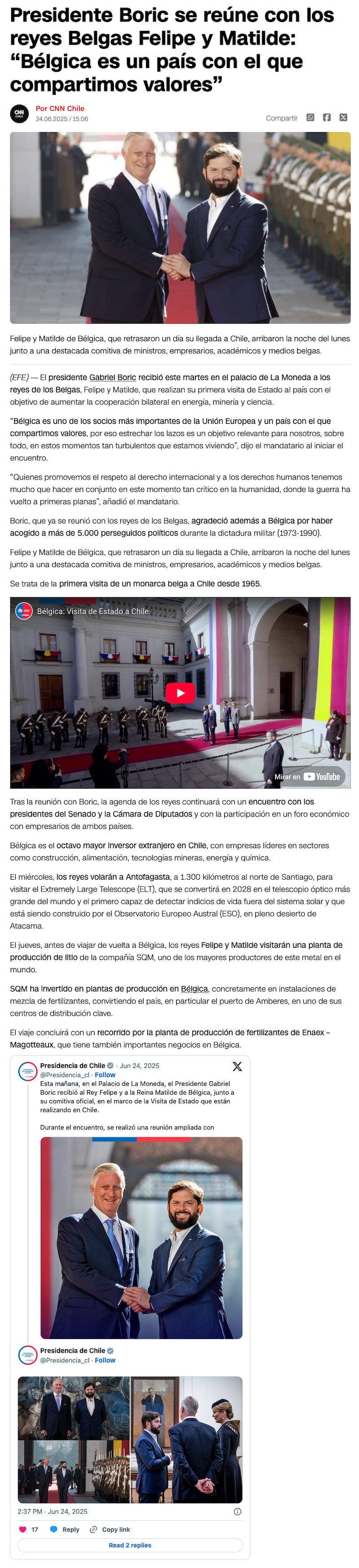 Reyes de Bélgica llegan a Chile para realizar una visita centrada en litio y astronomía - (24horas.cl)