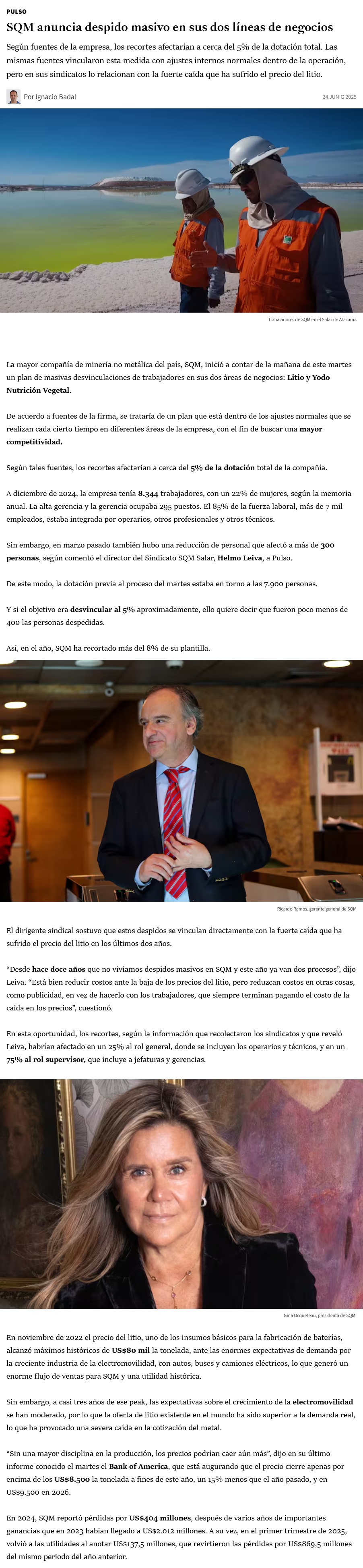 SQM anuncia despido masivo en sus dos líneas de negocios - (Pulso)