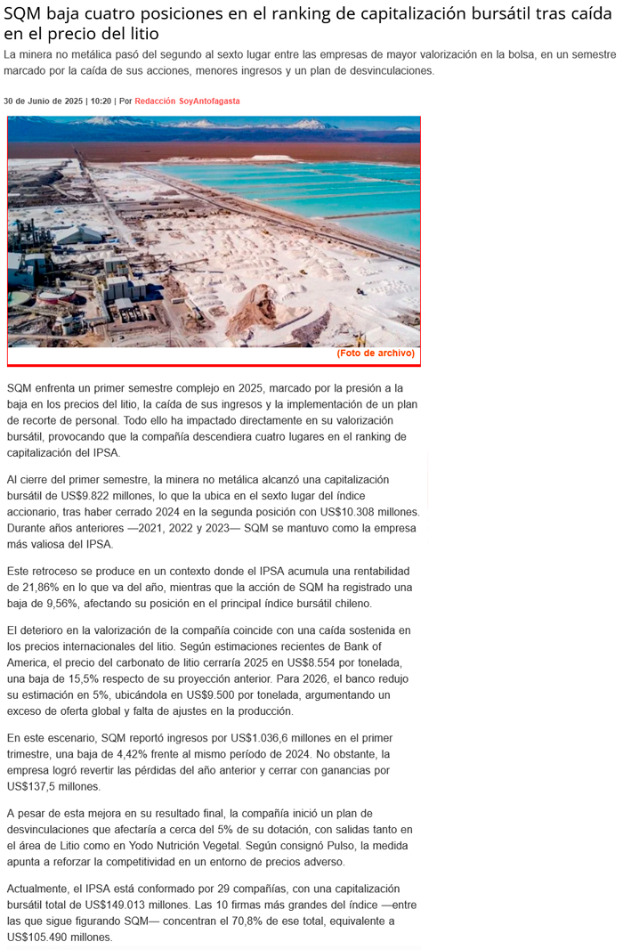 SQM cae cuatro posiciones en ranking de capitalización bursátil y Falabella sube al segundo puesto - (La Tercera Online)