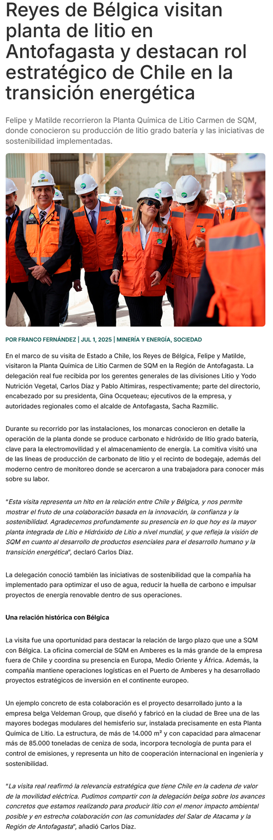 Reyes de Bélgica visitan planta de litio de SQM y destacan avances en sostenibilidad - (mineriayfuturo.cl)