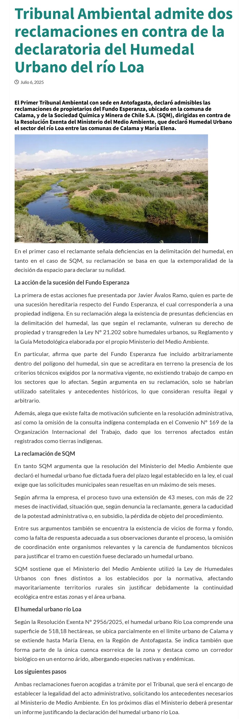 Tribunal Ambiental admite reclamaciones contra humedal urbano del río Loa presentadas por Fundo indígena y SQM - (elreferente.cl)