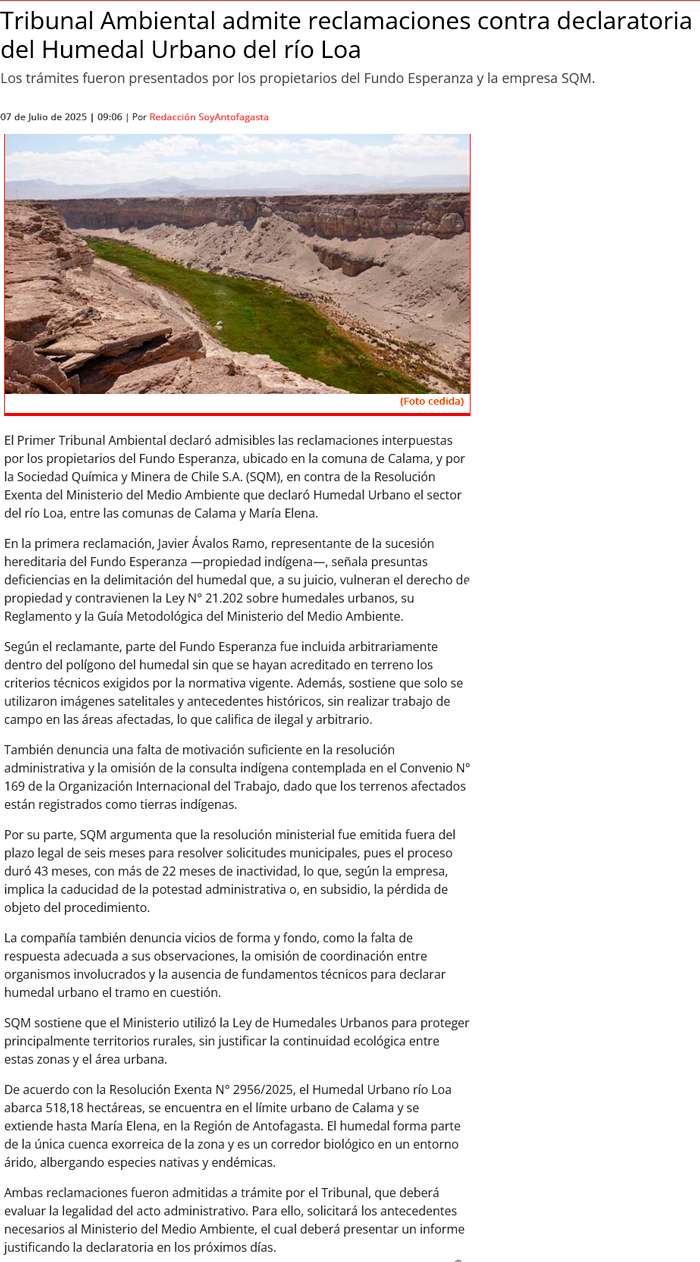 Admiten reclamaciones contra declaratoria de Humedal Urbano en río Loa - (diariosol.cl)
