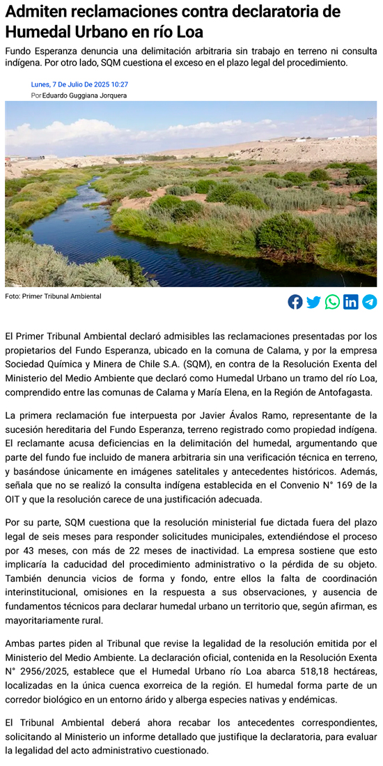 Tribunal Ambiental admite reclamaciones contra declaratoria del Humedal Urbano del río Loa - (soyantofagasta)