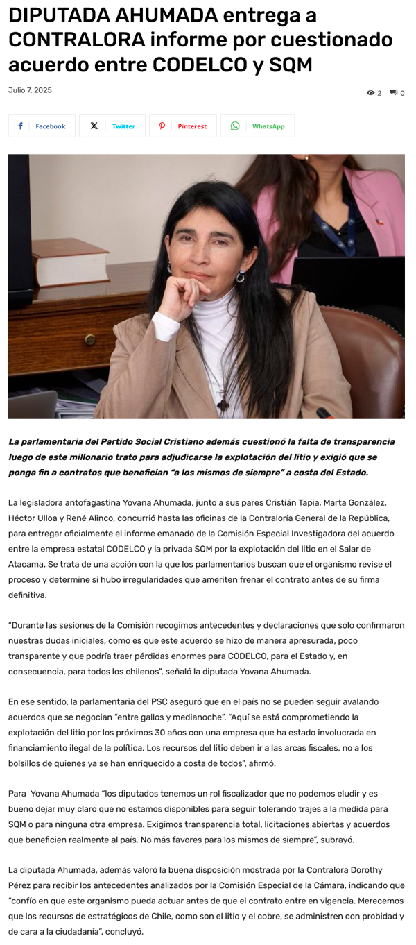 Diputada Yovana Ahumada entrega informe a Contraloría por acuerdo CODELCO-SQM: “No más trajes a la medida para las mismas empresas de siempre” - (diarioangamos)