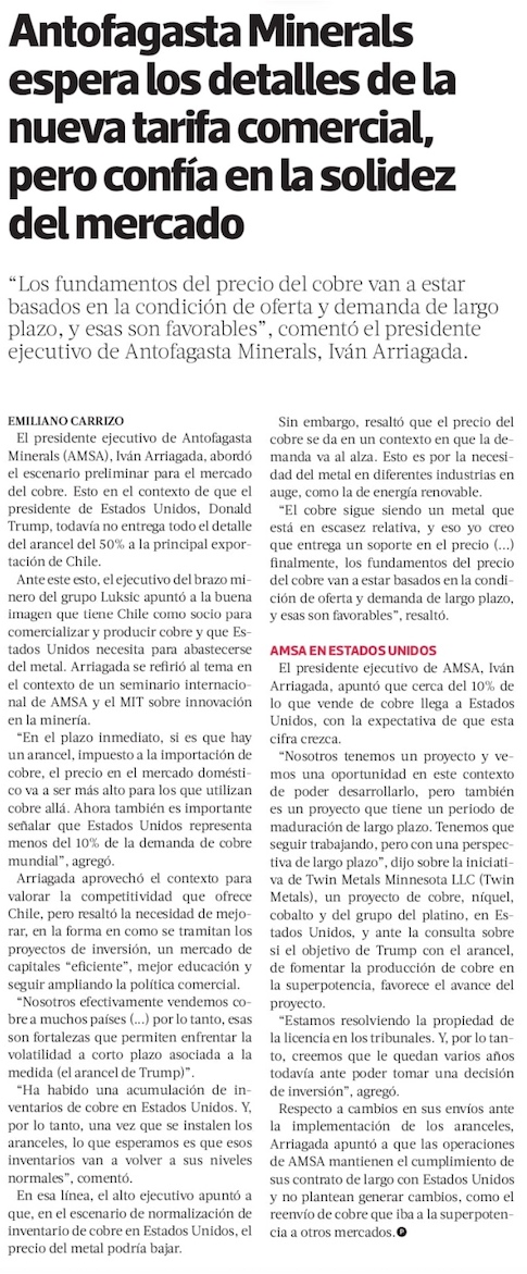 Antofagasta Minerals ve una “oportunidad” de desarrollar proyecto en EE.UU. con un arancel al cobre - (El Mercurio de Santiago)