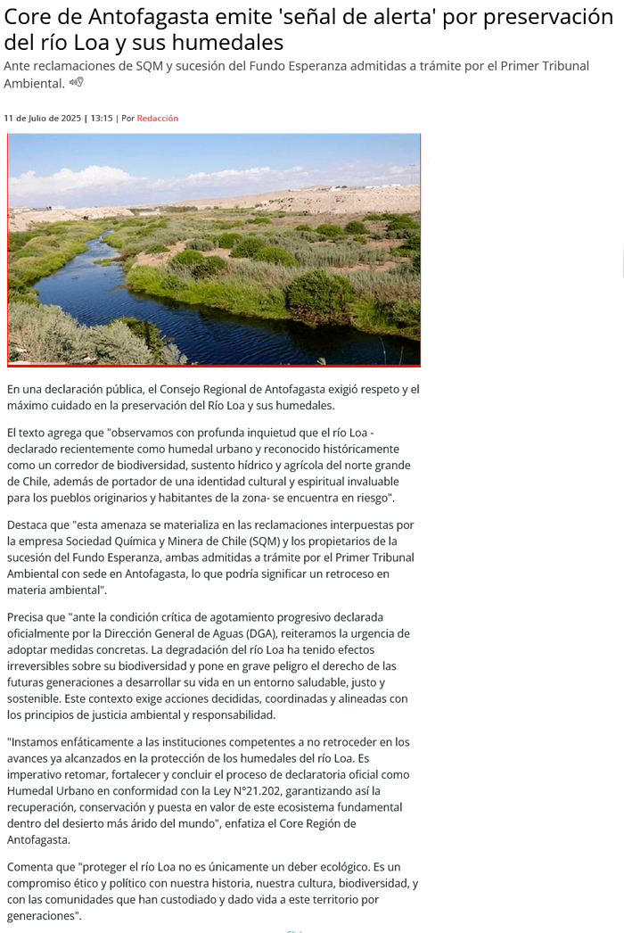 CORE emite declaración pública y exige respeto, cuidado y preservación del Rio Loa y sus humedales - (desiertofm.cl)