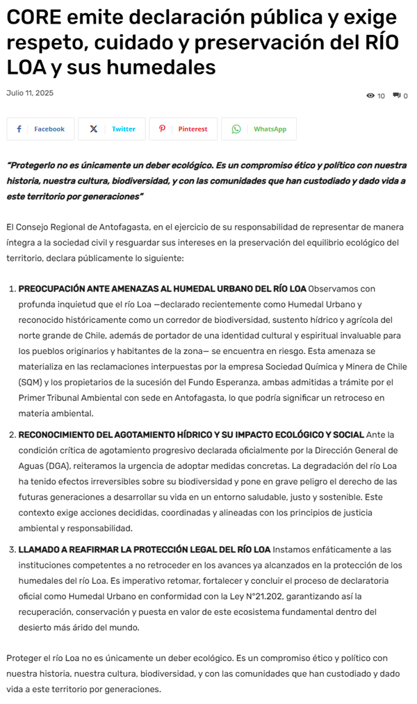 Core de Antofagasta emite 'señal de alerta' por preservación del río Loa y sus humedales - (soycalama)