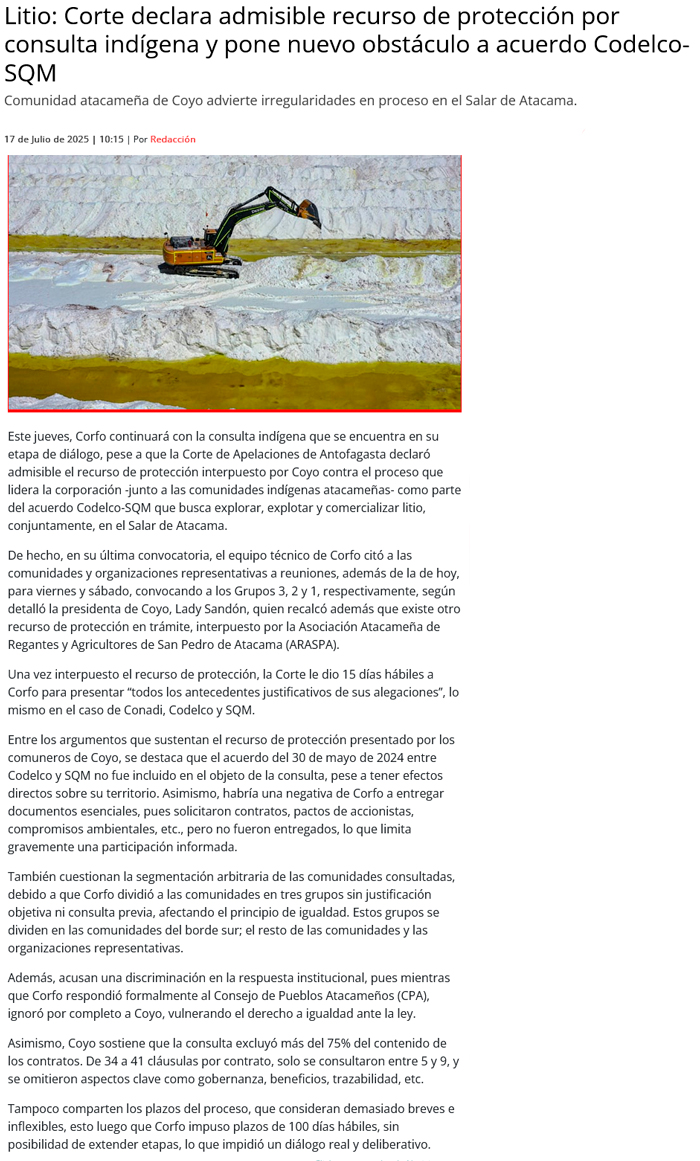 Acuerdo Codelco-SQM: Corte declara admisible recurso de protección por consulta indígena - (nuevaminería online)