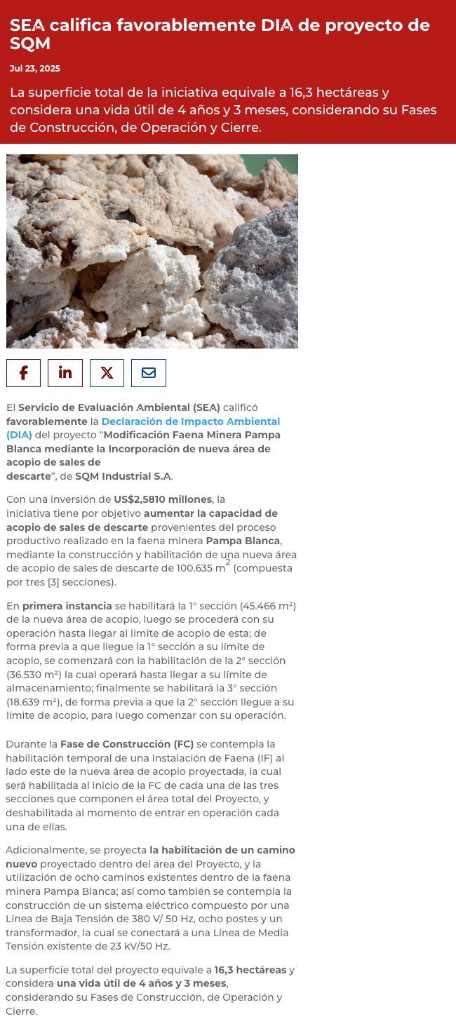 SEA aprueba DIA de proyecto minero de SQM en Pampa Blanca - (mundomineria.cl)
