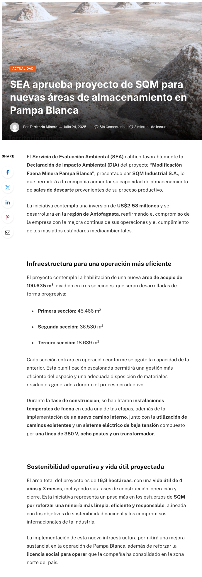 SQM obtiene luz verde para ampliar capacidad de manejo de residuos en Pampa Blanca - (mineriayfuturo.cl)
